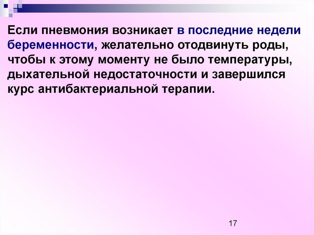 Если пневмония возникает в последние неделибеременности, желательно отодвинуть роды,