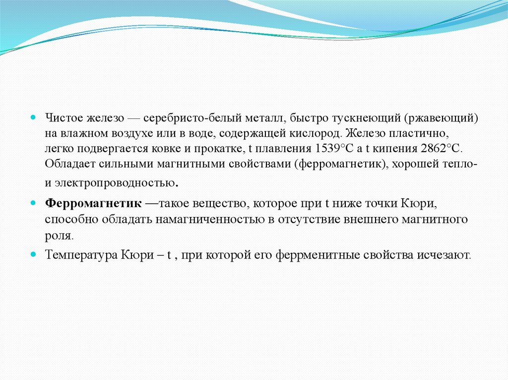 Чистое железо — серебристо-белый металл, быстро тускнеющий (ржавеющий)на влажном воздухе или в воде, содержащей кислород. Железо пластично,