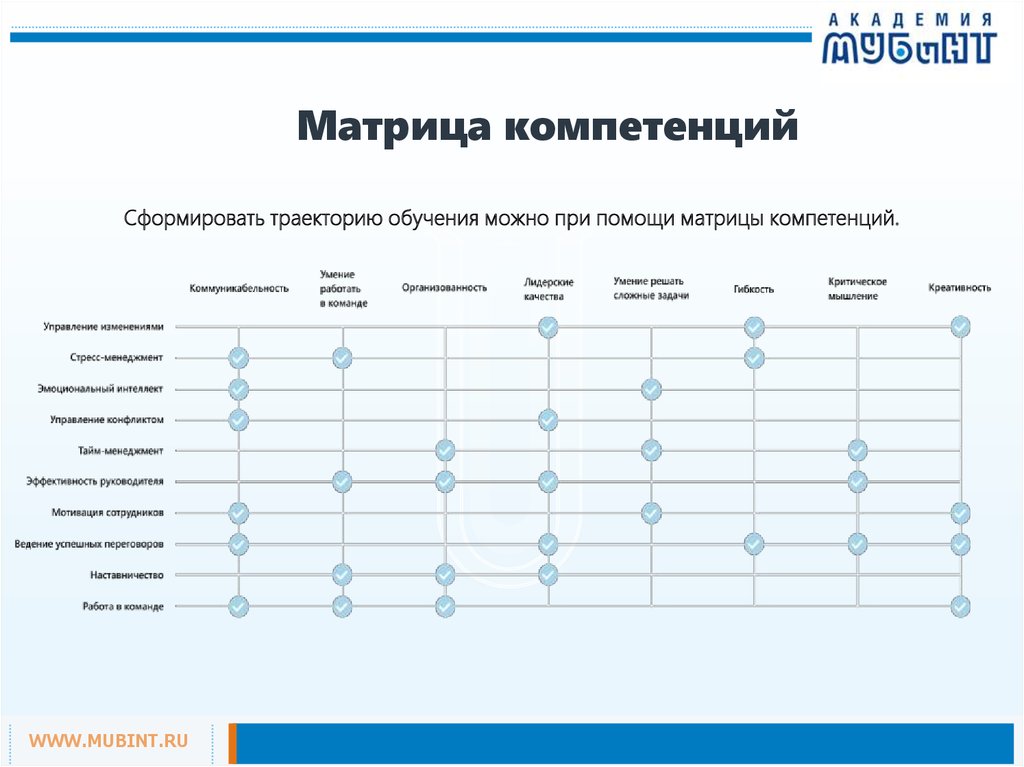 Матрица компетенцийСформировать траекторию обучения можно при помощи матрицы компетенций.