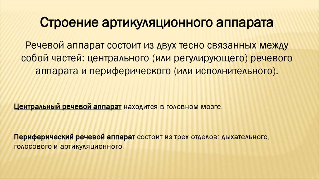 Строение артикуляционного аппаратаРечевой аппарат состоит из двух тесно связанных между