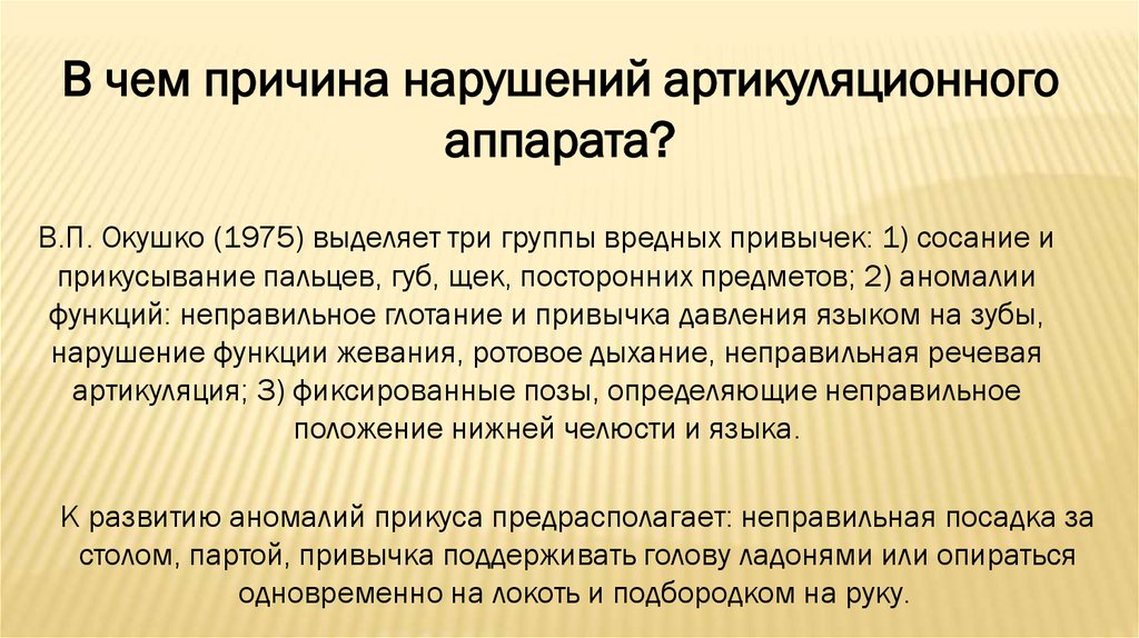 В.П. Окушко (1975) выделяет три группы вредных привычек: 1) сосание и