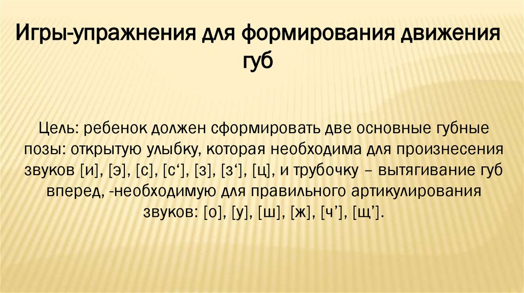 звуков [и], [э], [с], [с‘], [з], [з‘], [ц], и трубочку – вытягивание губ