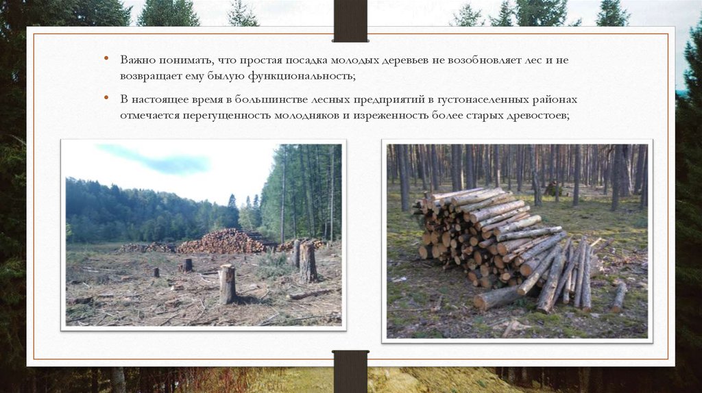 • Важно понимать, что простая посадка молодых деревьев не возобновляет лес и невозвращает ему былую функциональность;