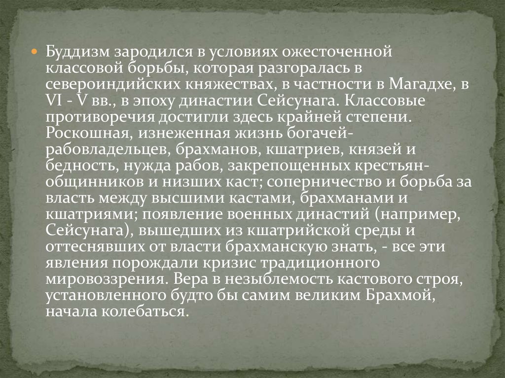 Буддизм зародился в условиях ожесточеннойклассовой борьбы, которая разгоралась в