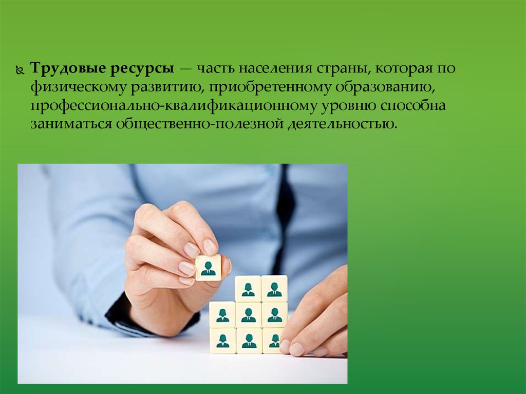Трудовые ресурсы — часть населения страны, которая пофизическому развитию, приобретенному образованию,