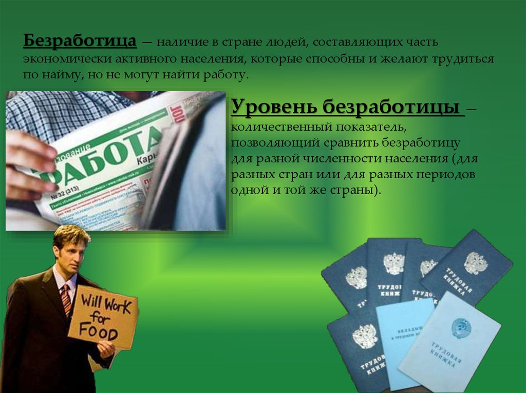 Безработица — наличие в стране людей, составляющих частьэкономически активного населения, которые способны и желают трудиться