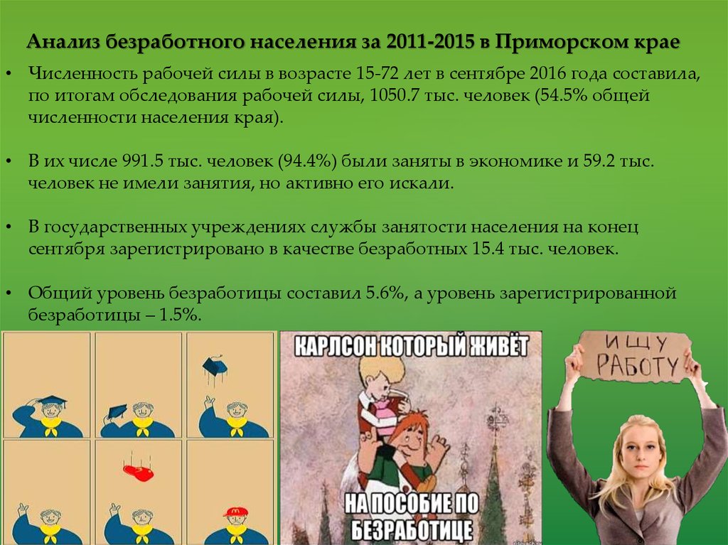 Анализ безработного населения за 2011-2015 в Приморском крае• Численность рабочей силы в возрасте 15-72 лет в сентябре 2016 года составила,