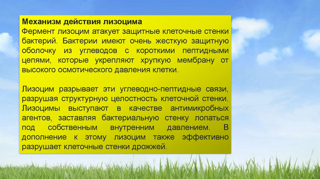 Механизм действия лизоцимаФермент лизоцим атакует защитные клеточные стенки