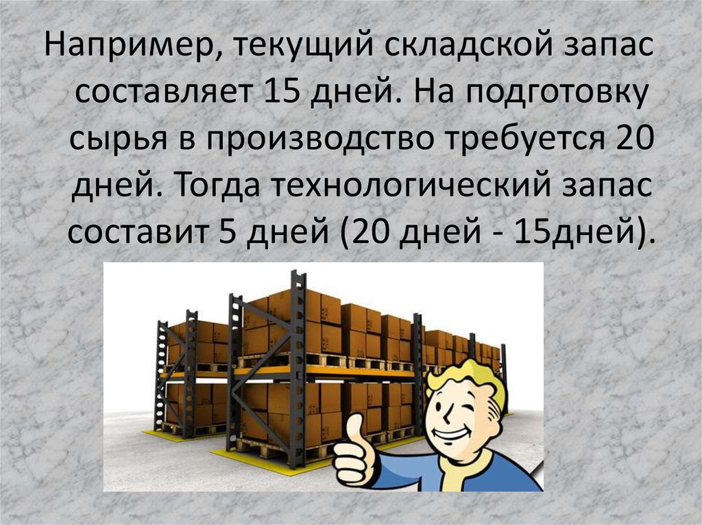 Например, текущий складской запассоставляет 15 дней. На подготовку