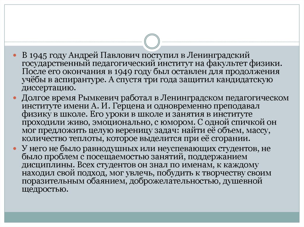 В 1945 году Андрей Павлович поступил в Ленинградскийгосударственный педагогический институт на факультет физики.