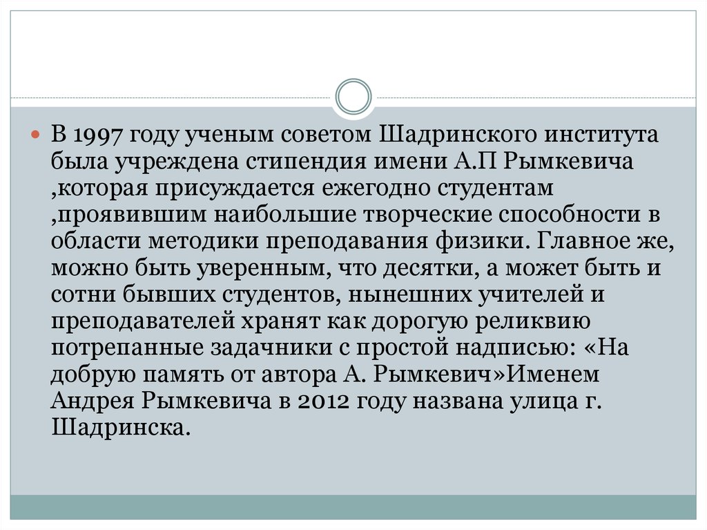 В 1997 году ученым советом Шадринского институтабыла учреждена стипендия имени А.П Рымкевича