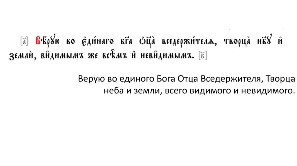 Верую во единого Бога Отца Вседержителя, Творцанеба и земли, всего видимого и невидимого.