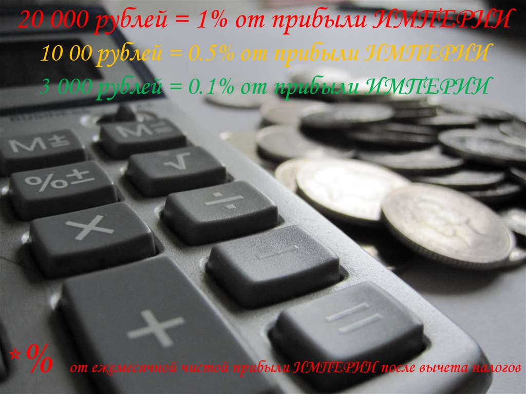 20 000 рублей = 1% от прибыли ИМПЕРИИ10 00 рублей = 0.5% от прибыли ИМПЕРИИ
