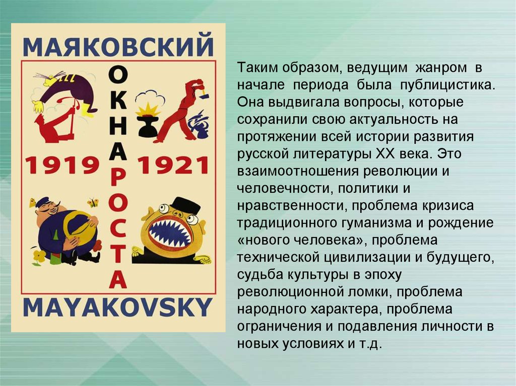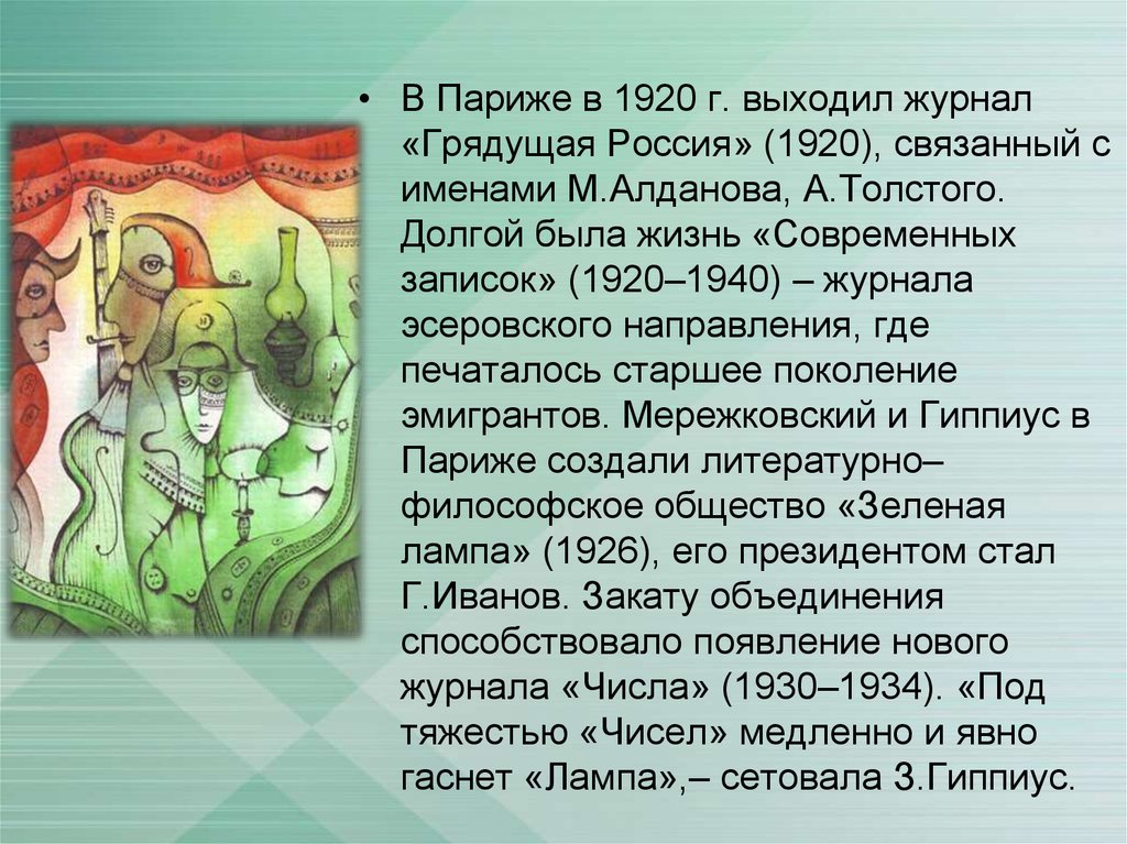 • Исход большой части русских писателей за рубеж такжеспособствовал возникновению различного рода