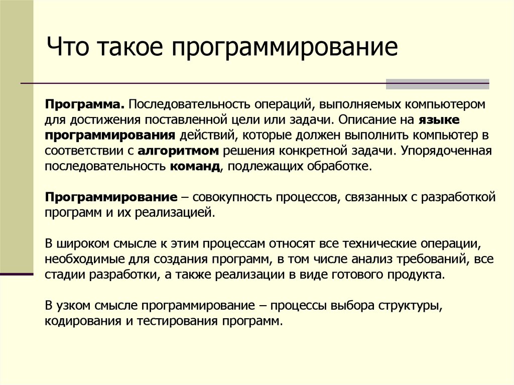 Что такое программированиеПрограмма. Последовательность операций, выполняемых компьютером