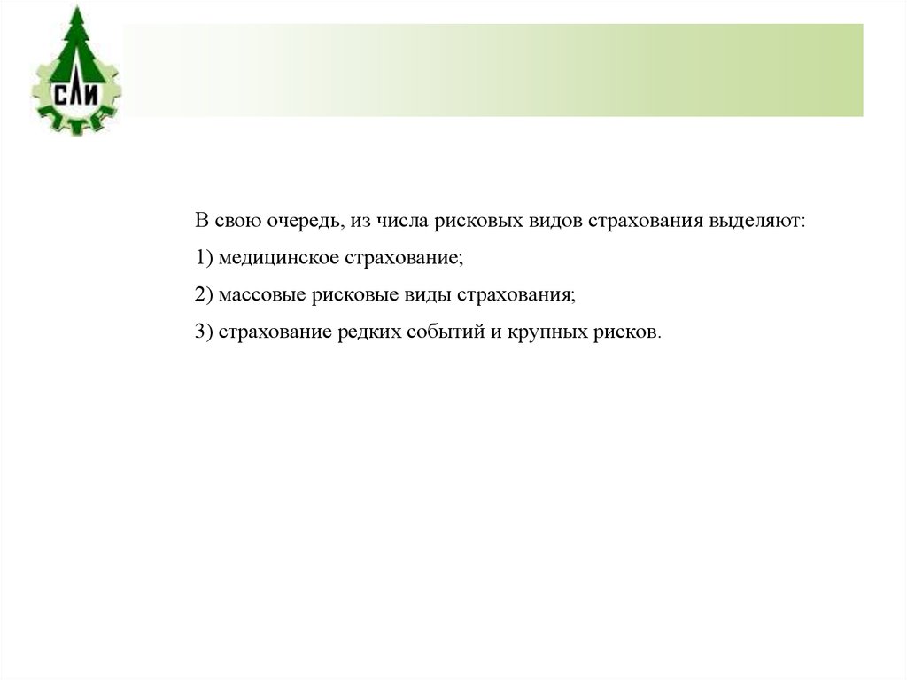 В свою очередь, из числа рисковых видов страхования выделяют:1) медицинское страхование;