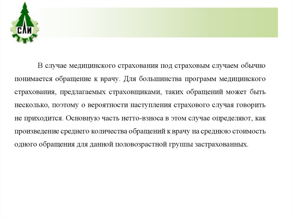 В случае медицинского страхования под страховым случаем обычнопонимается обращение к врачу. Для большинства программ медицинского