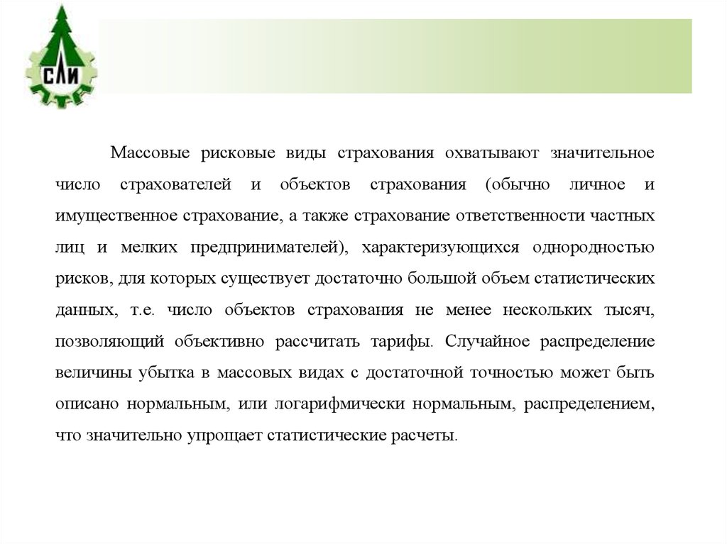 данных, т.е. число объектов страхования не менее нескольких тысяч,
