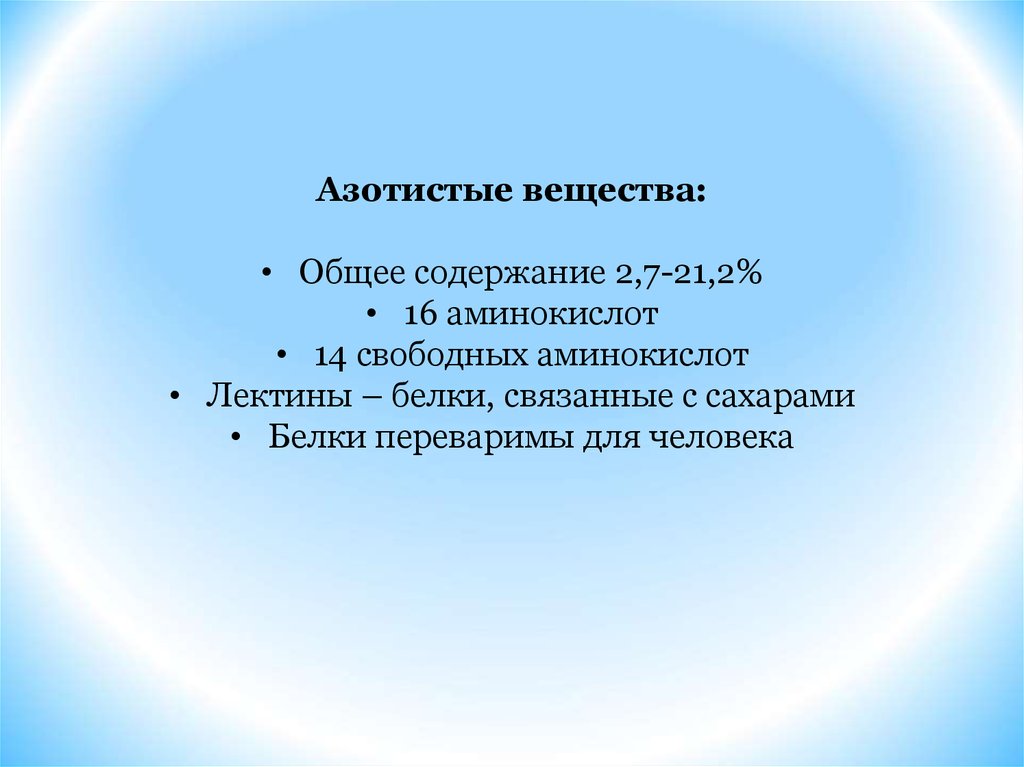 Азотистые вещества:• Общее содержание 2,7-21,2%