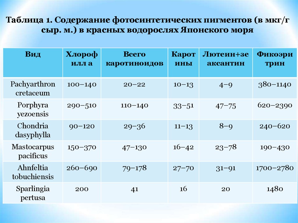 Таблица 1. Содержание фотосинтетических пигментов (в мкг/гсыр. м.) в красных водорослях Японского моря