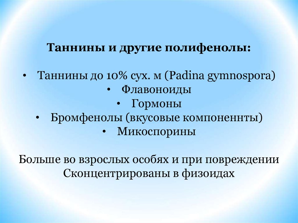 Таннины и другие полифенолы:• Таннины до 10% сух. м (Padina gymnospora)