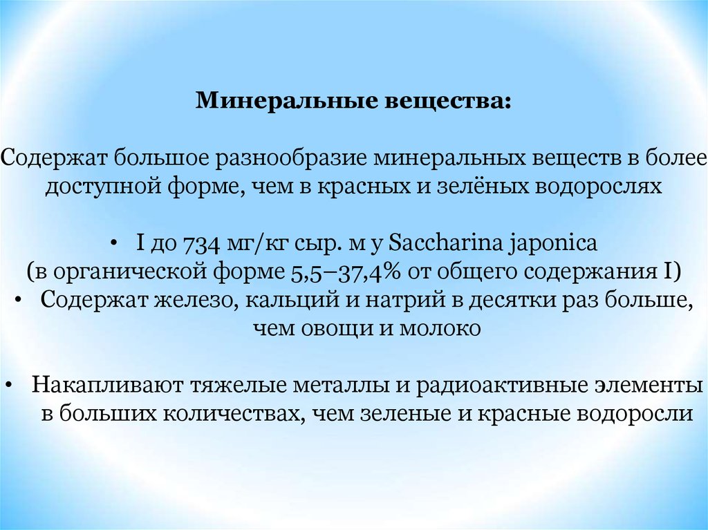 Минеральные вещества:Содержат большое разнообразие минеральных веществ в более