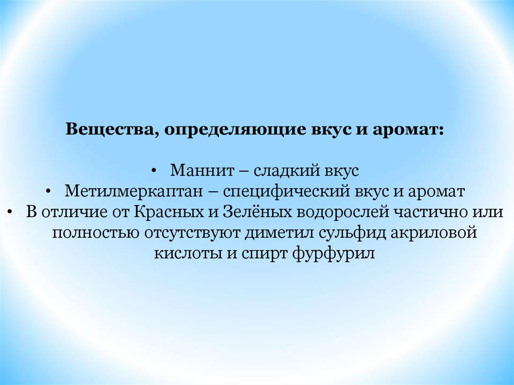 Вещества, определяющие вкус и аромат:• Маннит – сладкий вкус