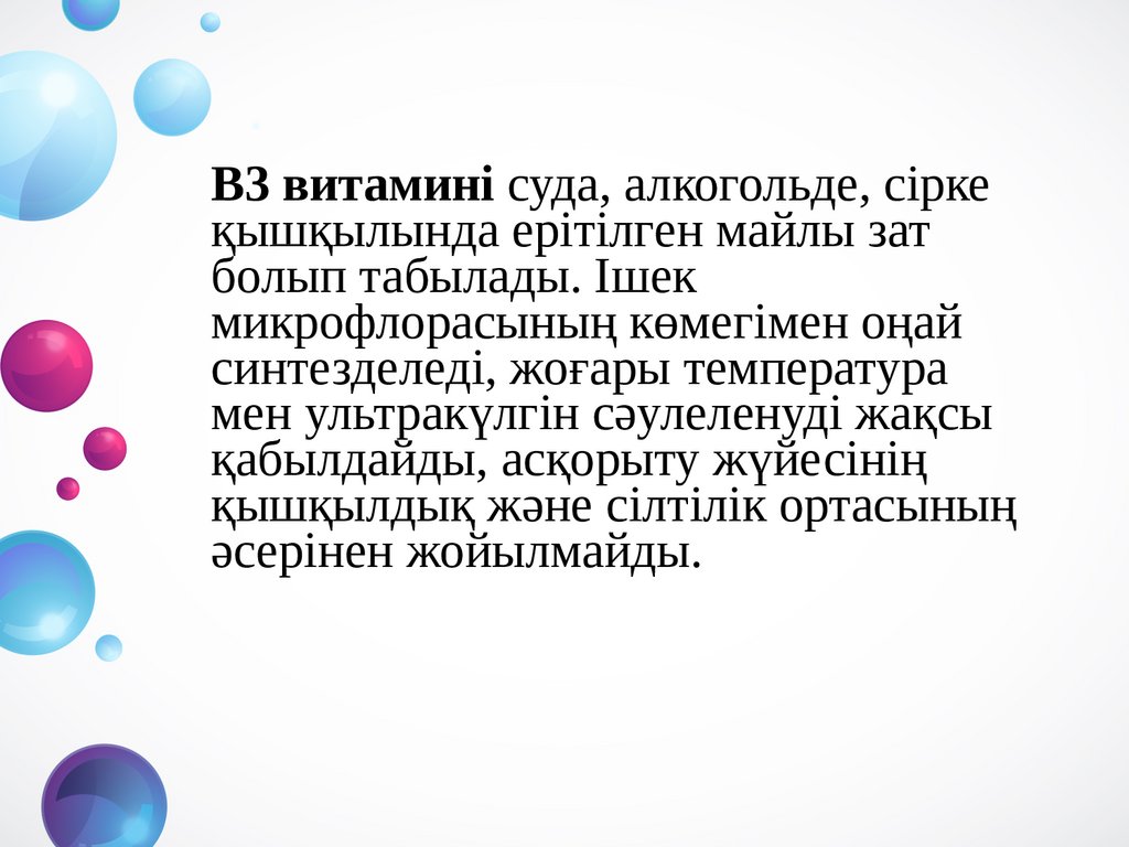 В3 витамині суда, алкогольде, сірке қышқылында ерітілген майлы зат болып табылады
