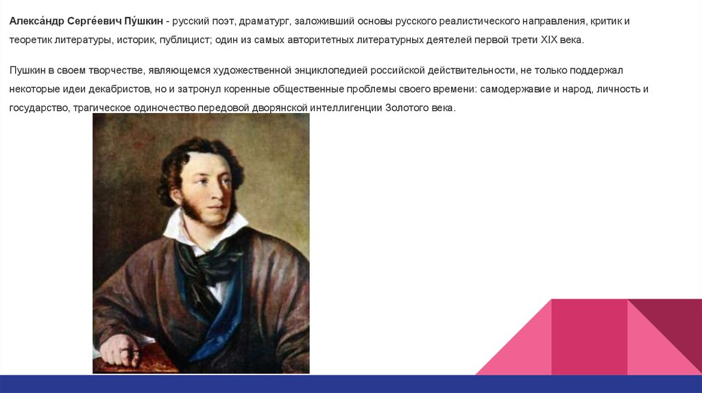 Алекса́ндр Серге́евич Пу́шкин - русский поэт, драматург, заложивший основы русского реалистического направления, критик итеоретик литературы, историк, публицист; один из самых авторитетных литературных деятелей первой трети XIX века.