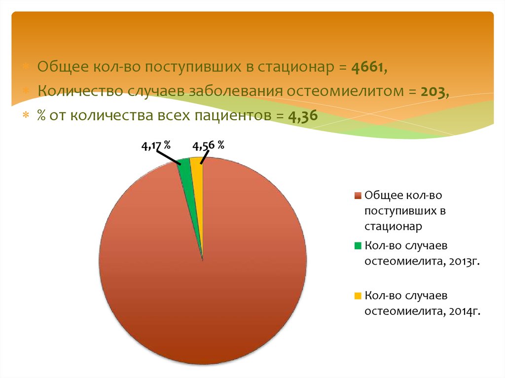 Общее кол-во поступивших в стационар = 4661,Количество случаев заболевания остеомиелитом = 203,
