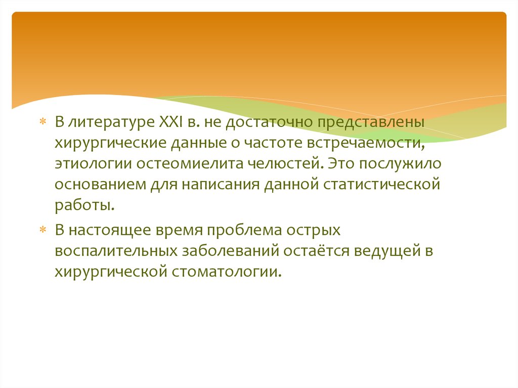 Изучить частоту встречаемости,этиологию остеомиелита челюсти по