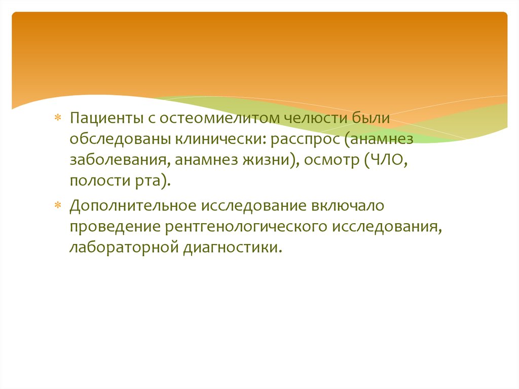 Пациенты с остеомиелитом челюсти былиобследованы клинически: расспрос (анамнез