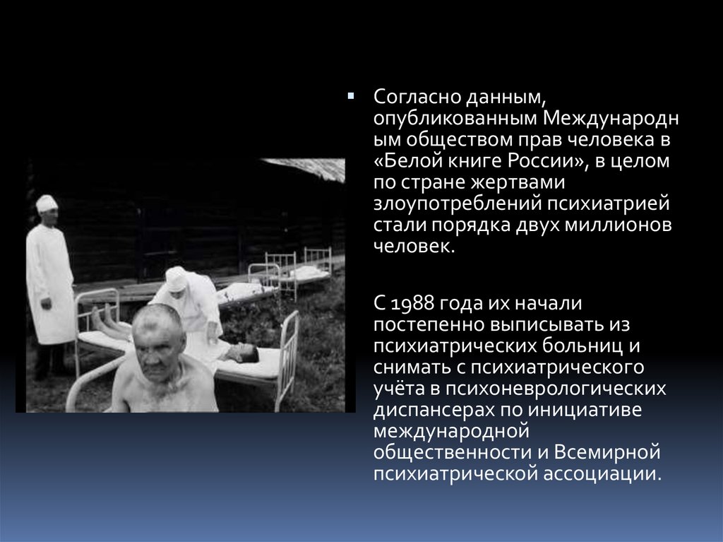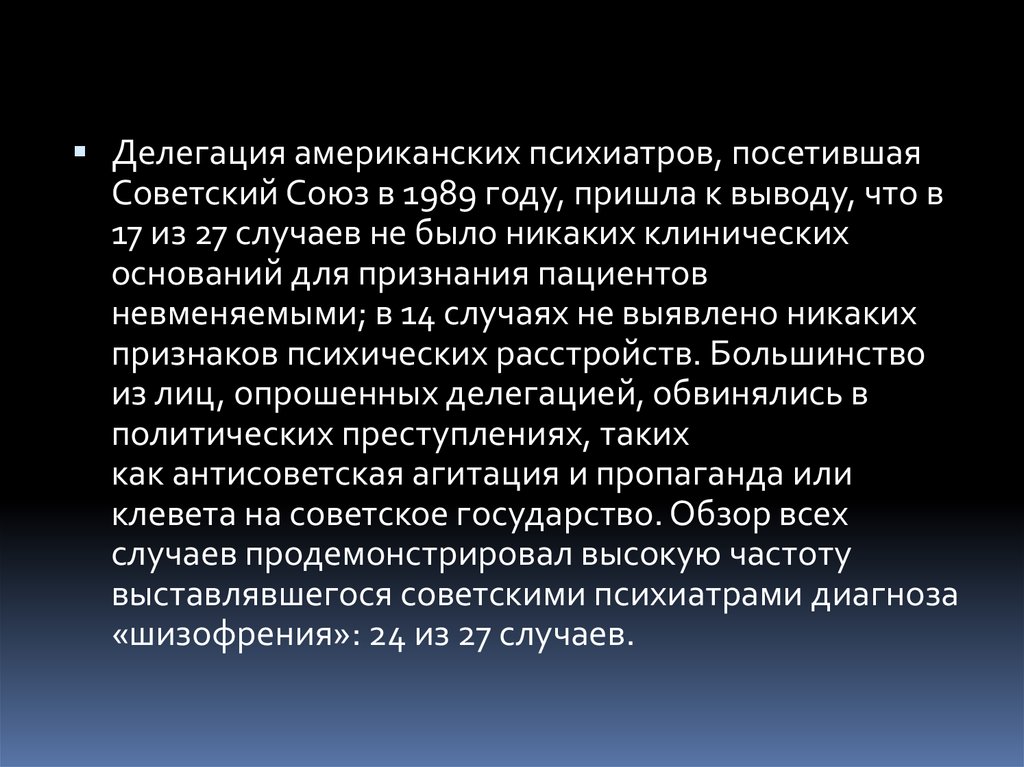 Делегация американских психиатров, посетившаяСоветский Союз в 1989 году, пришла к выводу, что в