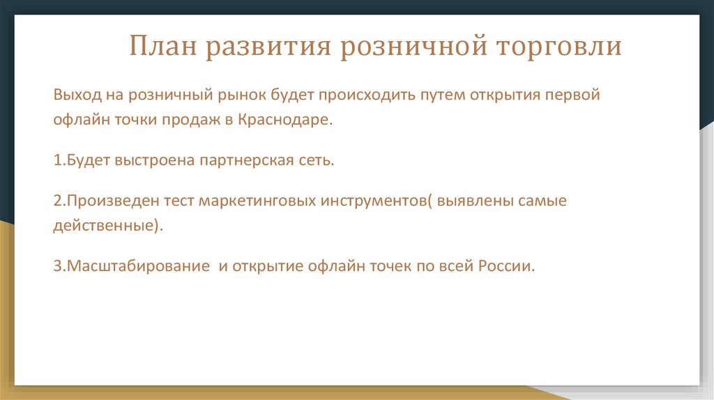 План развития розничной торговлиВыход на розничный рынок будет происходить путем открытия первой