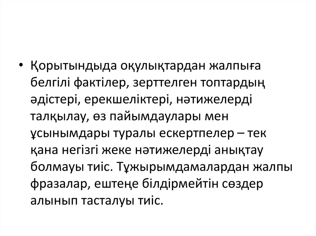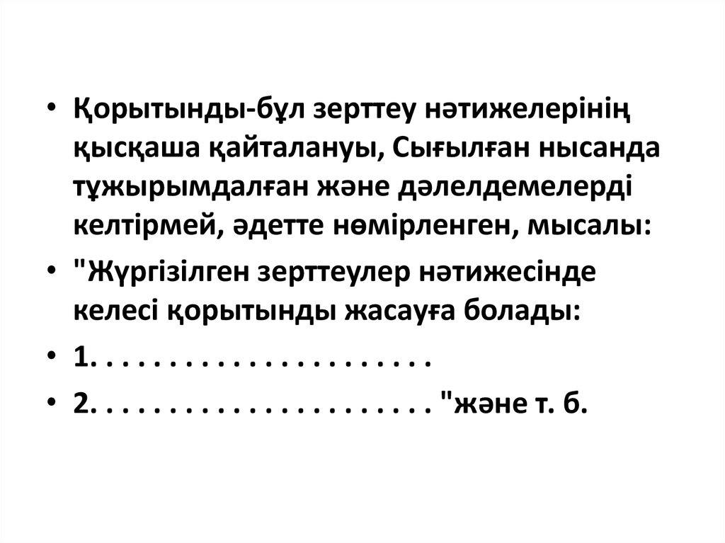 • Қорытынды бөлім алынған нәтижелердіталдау жолымен жасалған негізделген