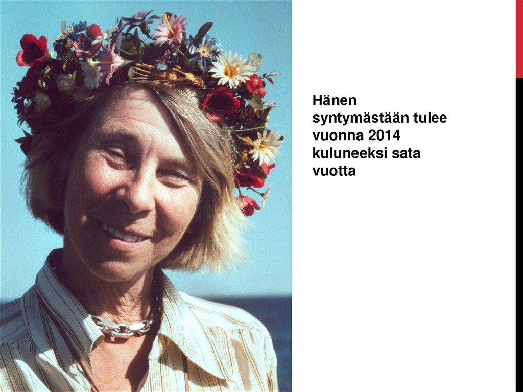 2. Tuve Jansson Tove Jansson (1914-2001) on Suomen tunnetuimpia taiteilijoita, ja hänen kirjojaan on käännetty tällä hetkellä jo
