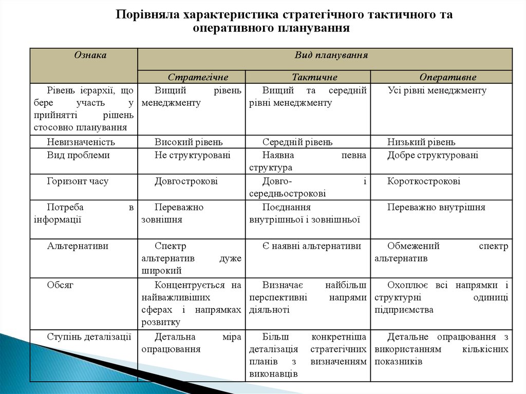 Порівняла характеристика стратегічного тактичного таоперативного планування