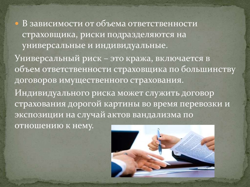 В зависимости от объема ответственностистраховщика, риски подразделяются на