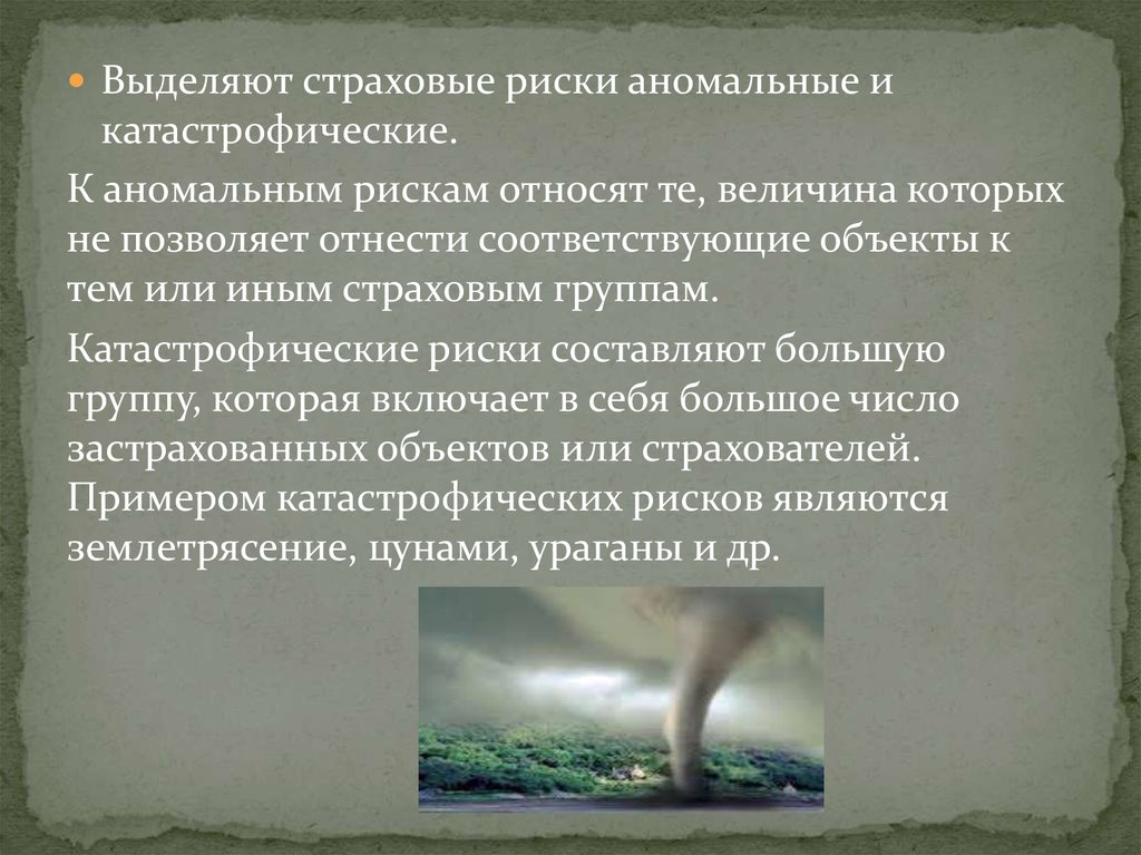 Выделяют страховые риски аномальные икатастрофические.