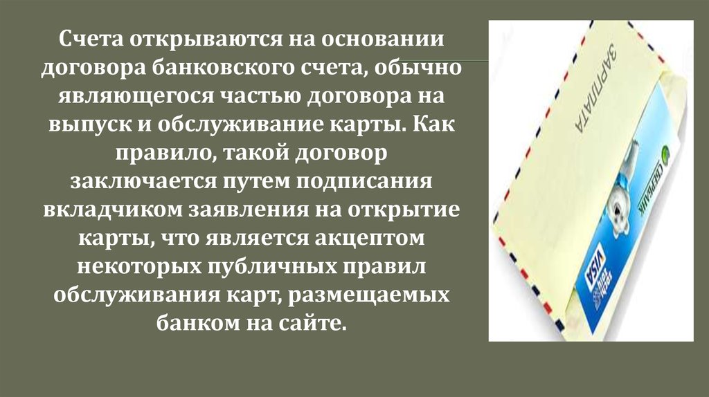Счета открываются на основаниидоговора банковского счета, обычно