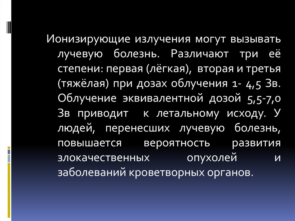 Ионизирующие излучения могут вызыватьлучевую болезнь. Различают три её