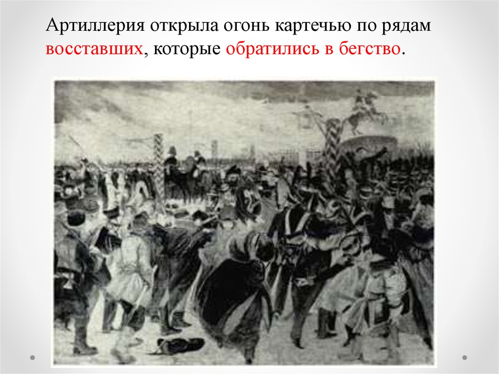 Артиллерия открыла огонь картечью по рядамвосставших, которые обратились в бегство.