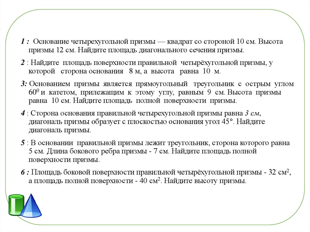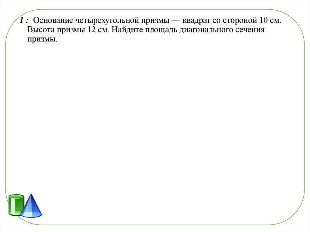 1 : Основание четырехугольной призмы — квадрат со стороной 10 см.Высота призмы 12 см. Найдите площадь диагонального сечения