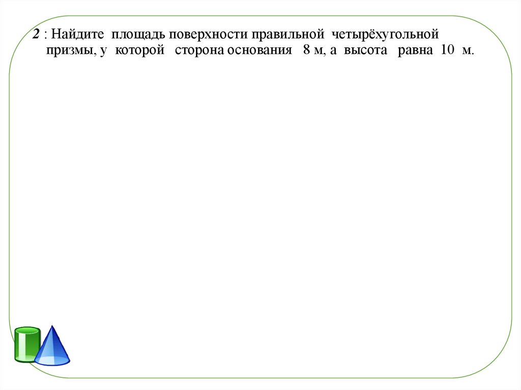 2 : Найдите площадь поверхности правильной четырёхугольнойпризмы, у которой сторона основания 8 м, а высота равна 10 м.