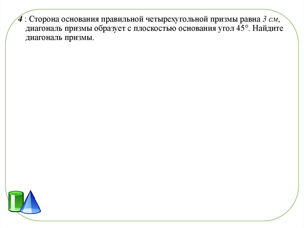 4 : Сторона основания правильной четырехугольной призмы равна 3 см,диагональ призмы образует с плоскостью основания угол 45°. Найдите