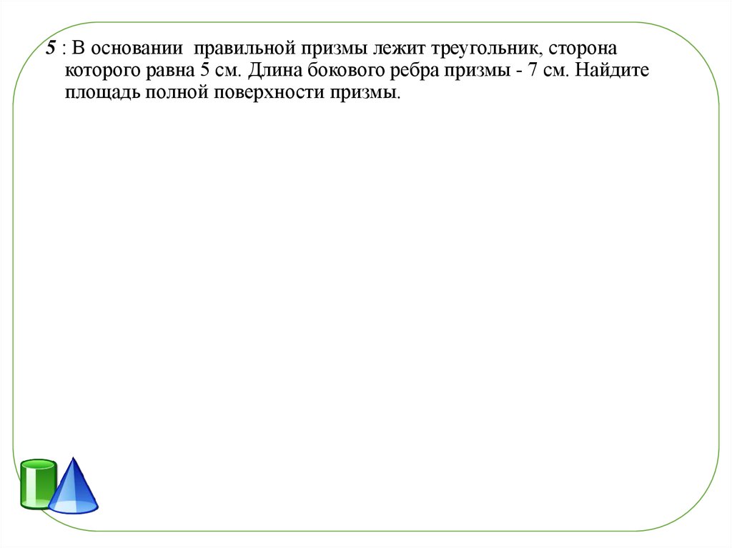 5 : В основании правильной призмы лежит треугольник, сторонакоторого равна 5 см. Длина бокового ребра призмы - 7 см. Найдите