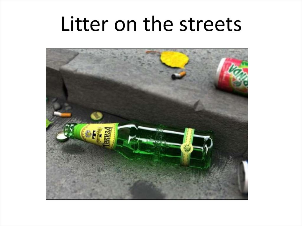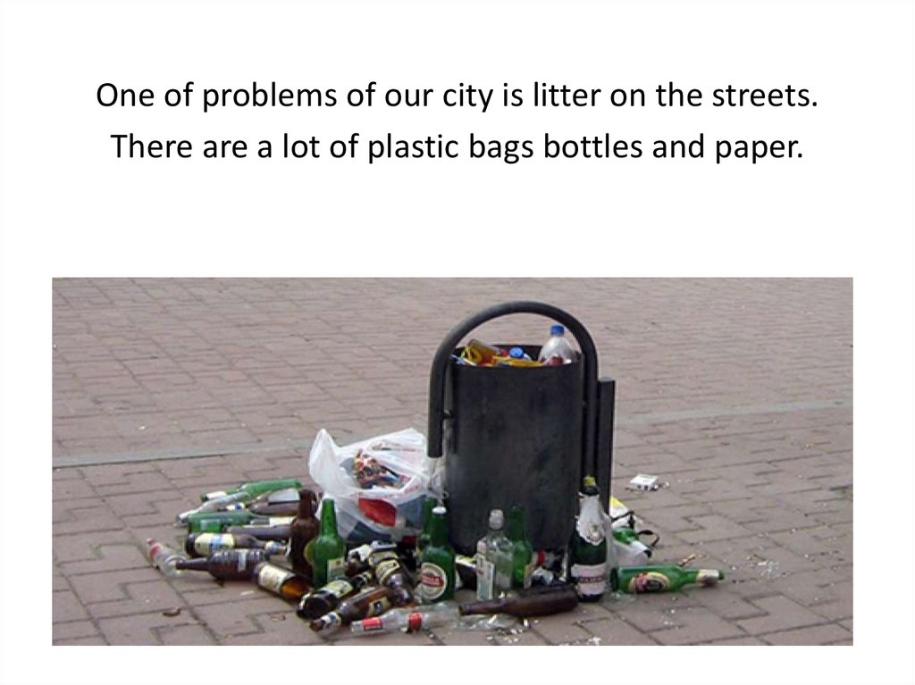One of problems of our city is litter on the streets.There are a lot of plastic bags bottles and paper.