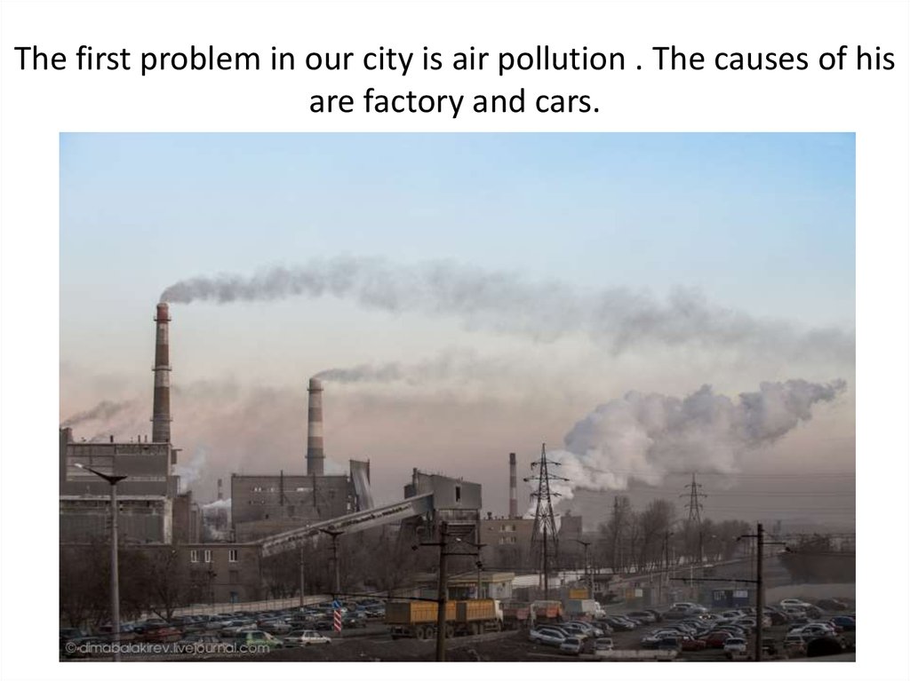 The first problem in our city is air pollution . The causes of hisare factory and cars.