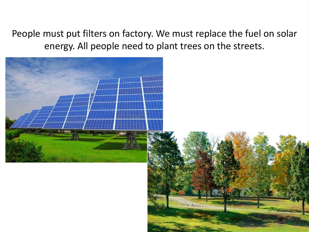 People must put filters on factory. We must replace the fuel on solarenergy. All people need to plant trees on the streets.