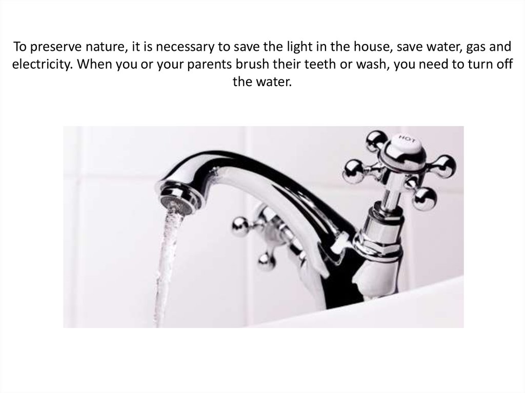 To preserve nature, it is necessary to save the light in the house, save water, gas andelectricity. When you or your parents brush their teeth or wash, you need to turn off